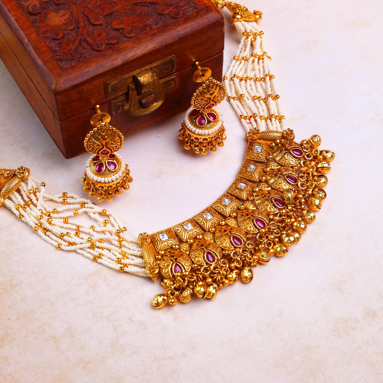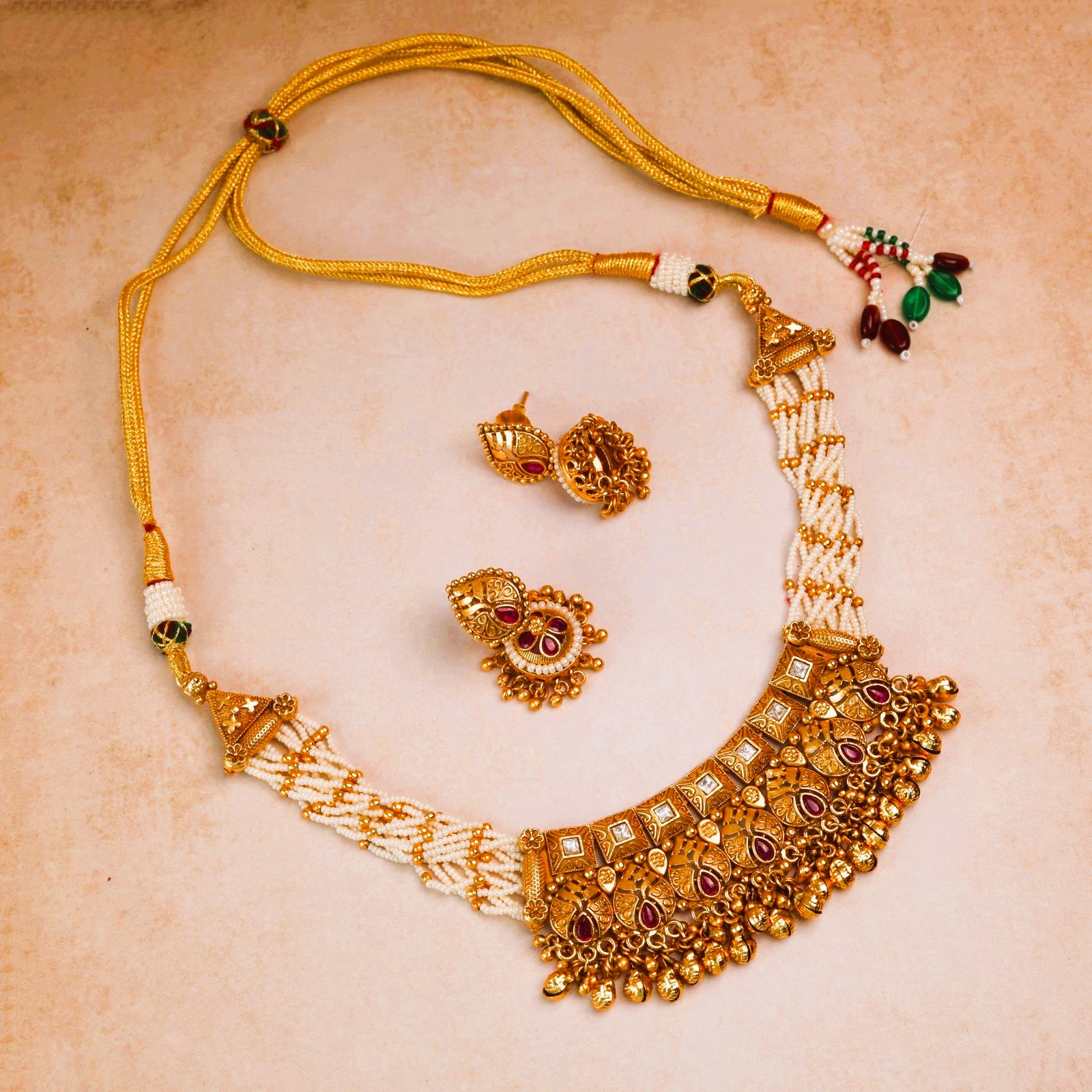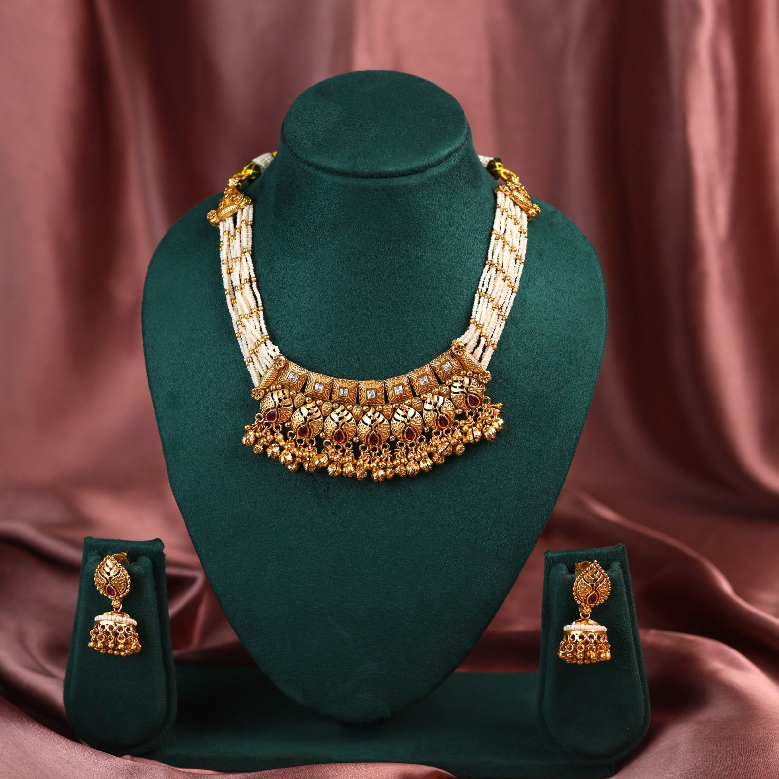 This exquisite necklace set is a perfect blend of cultural artistry and modern finesse. Inspired by temple designs, its reflects the richness of Indian heritage. The handcrafted motifs showcase intricate floral and geometric patterns. Sparkling pink stones in antique gold give it a royal and feminine essence. Layer of pearls strings add classic grace and purity to the design. The balanced structure ensures both comfort and grandeur for festive wear. Matching earrings enhance its cohesive, majestic appeal. Ideal for bridal looks, cultural events and traditional festivities. Each detail speaks of timeless craftsmanship and elegant sophistication. A heritage treasure that embodies devotion, beauty, and pride in tradition.