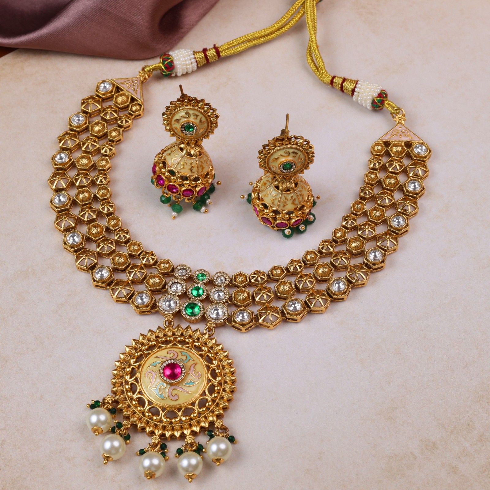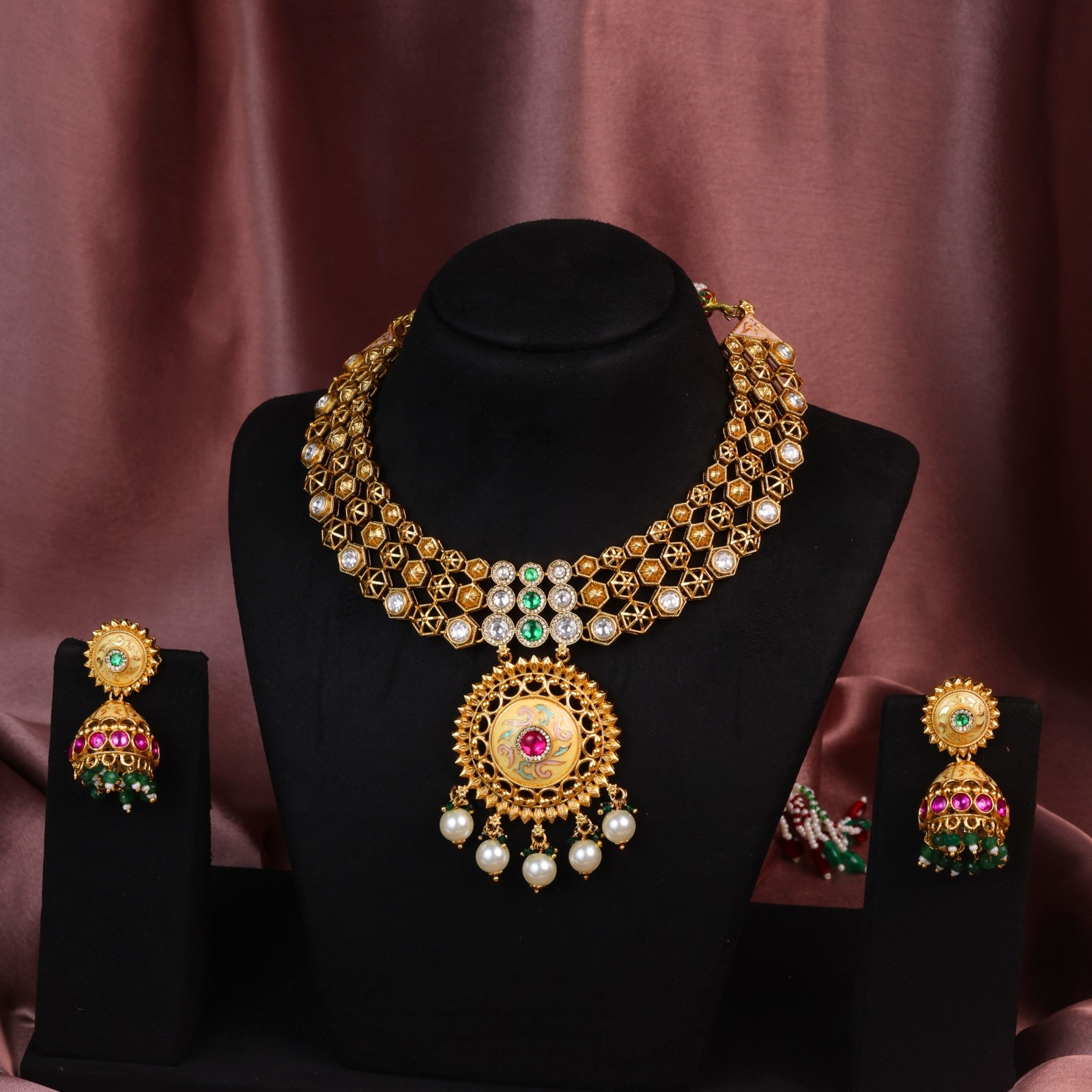 Crafted in antique gold finish , this necklace reflects timeless eoyal elegance. Embellished with swarovski stones, it radiates unmatched sparkle and sophistication.The central meenakari art work adds a regal and colorful charm to the design. Hanging pearl drops enhance its grace with a touch of classic tradition. A fusion of geometric and floral patterns makes it a unique designer piece. Green and pink stones highlights make it perfect for festive outfits. Comes with a matching jhumka- style earring, completing the royal set.