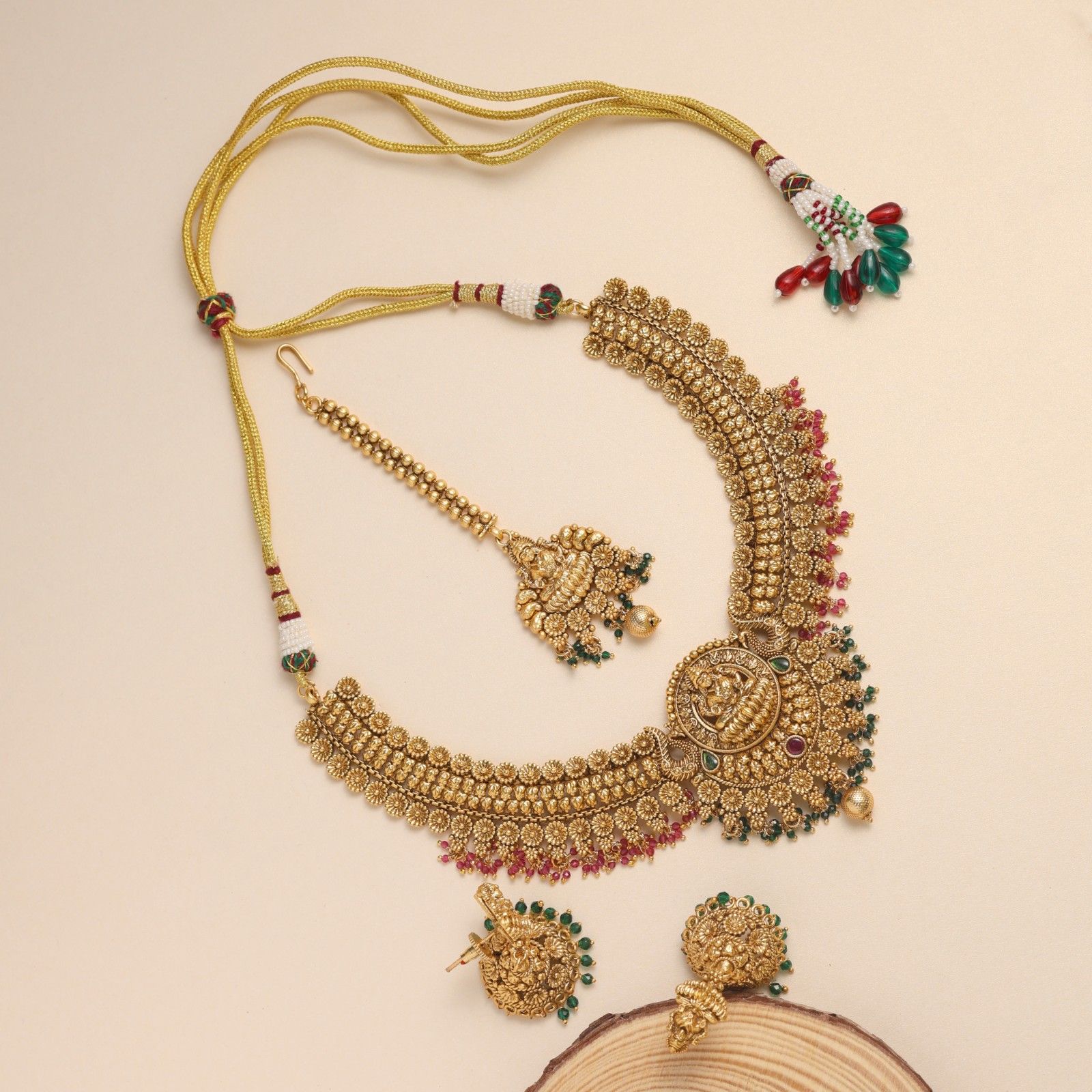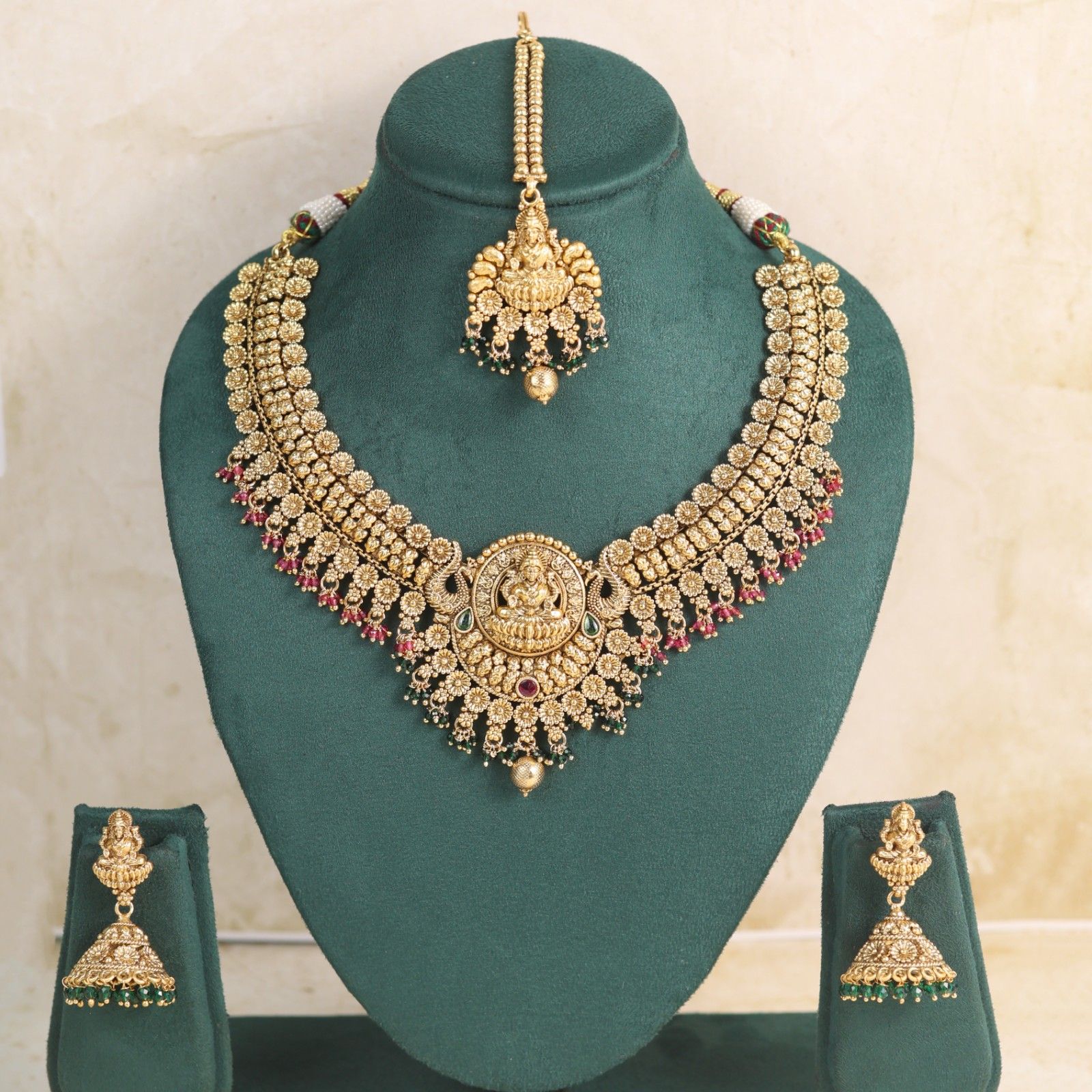 Crafted with intricate temple artistry, this necklace embodies the blessings of Goddess Annapurna. The centerpiece features exquisite goddess motifs symbolizing nourishment, devotion, and prosperity. Antique gold finish brings out the depth and elegance of traditional craftsmanship. Adorned with ruby and emerald accents, it adds a royal touch of color and vibrance. Perfectly paired earrings and maang tikka complete the divine ensemble. Every element reflects the beauty of South Indian heritage and temple jewelry legacy. Designed for festive occasions, weddings and traditional ceremonies. Its handcrafted detailing mirrors sacred architecture and goddess iconography. A timeless adornment that connects spirituality with beauty. Wear it to radiate divine grace and the eternal blessings of Goddess Annapurna.