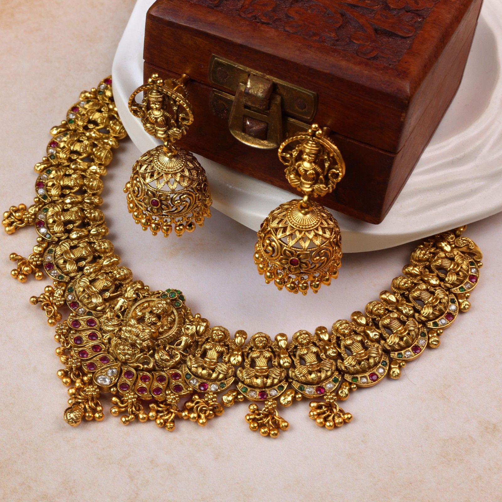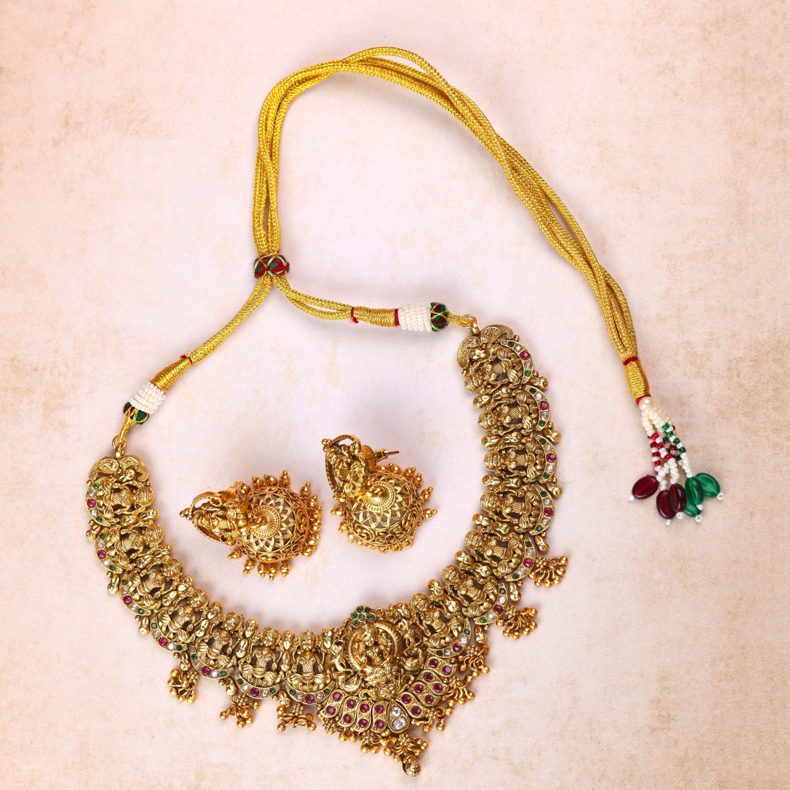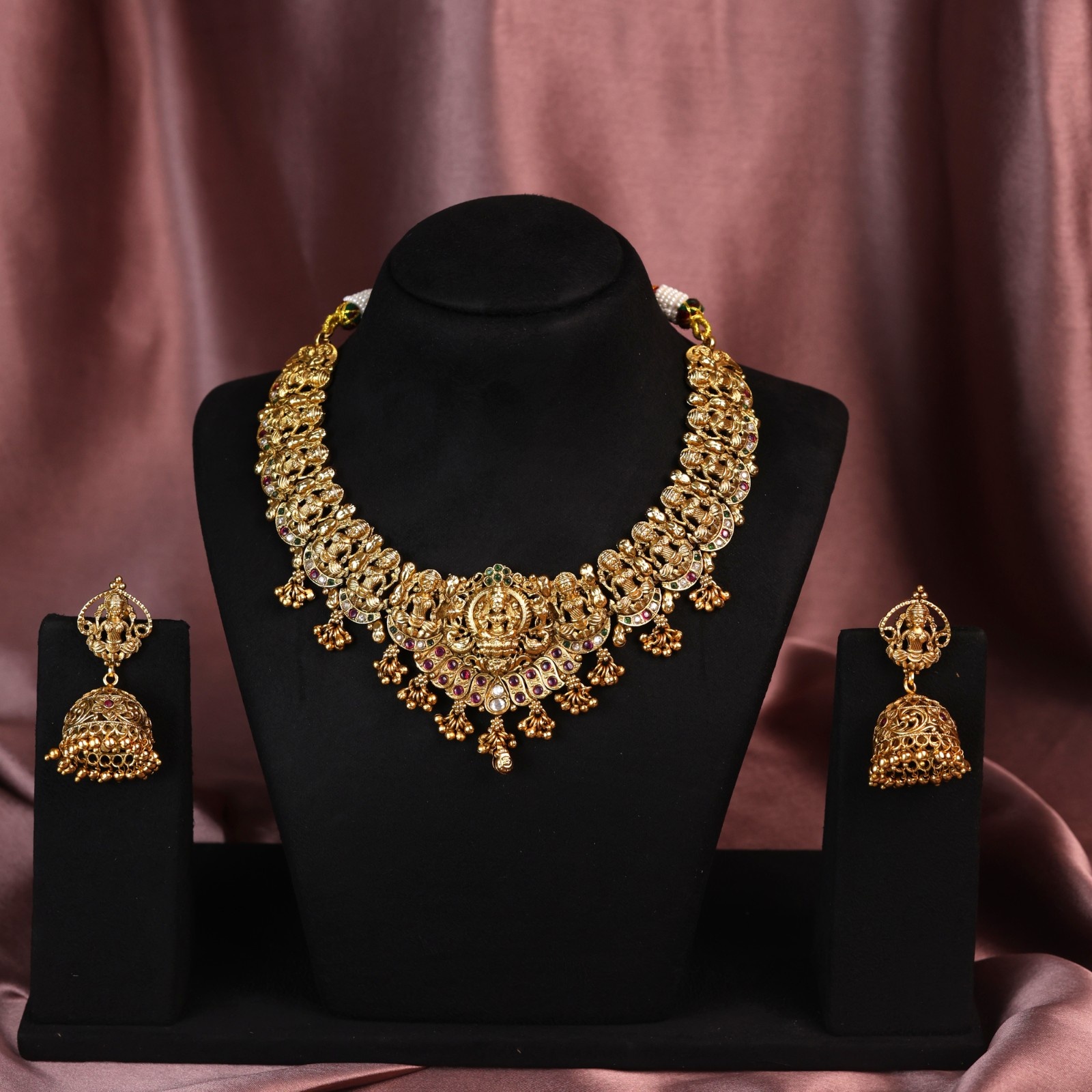 This exquisite necklace set celebrated India's ancient temple artistry, blending devotion and luxury in every detail. Handcrafted with goddess engravings and intricate floral work, it's enriched with ruby and green accents, The Antique gold touch brings a royal grandeur to any bridal or festive attire. Its matching jhumkas complete the divine ensemble beautifully. A statement piece that reflects culture, craftsmanship, and spiritual elegance.