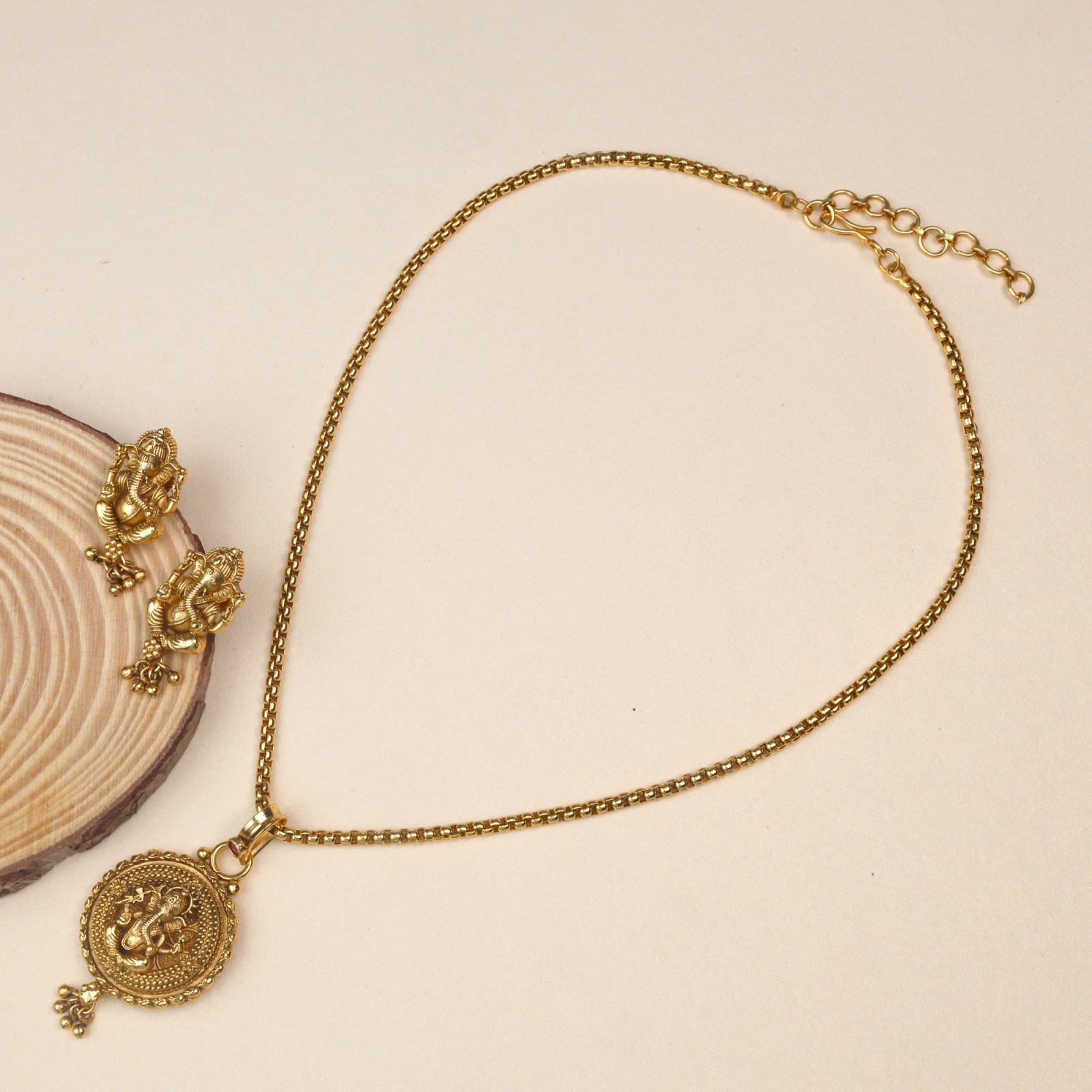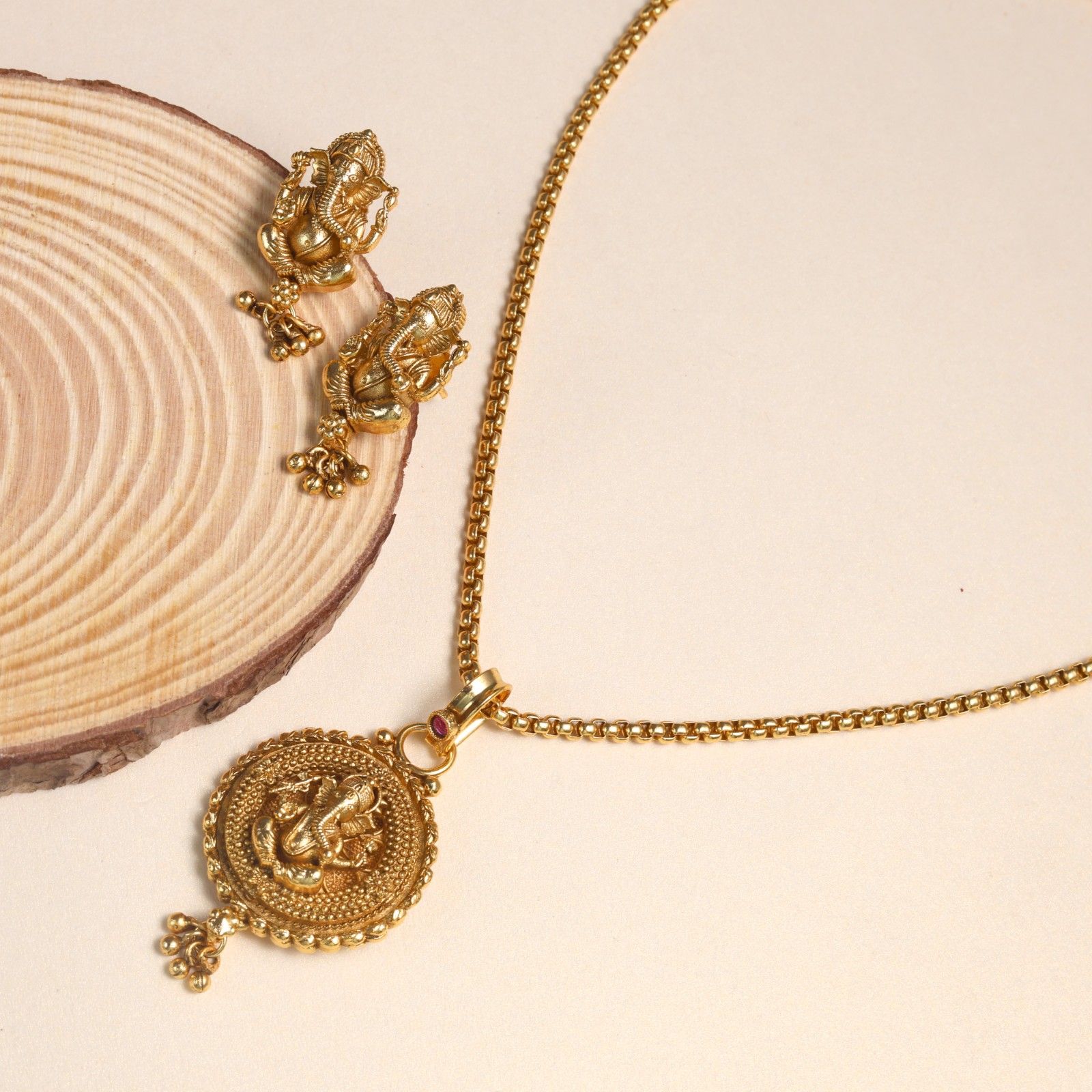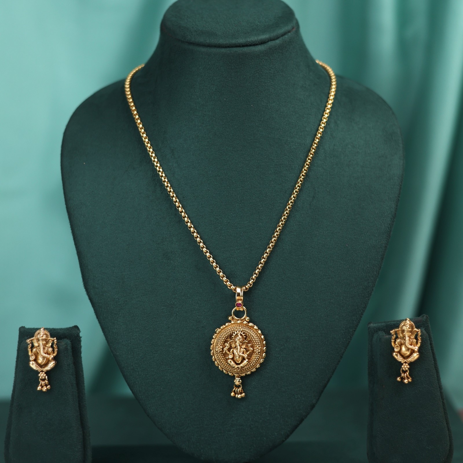 The divine grace gold pendant with chain is a perfect combination of devotion and elegance. Designed with intricate detailing, the pendant features lord ganesha , the remover of obstacles and harbinger , of good fortune. The circular pendant has a finely textured border, enhancing its classic appearance. At the center, ganesha is depicted in a graceful posture, radiating spiritual energy. Crafted in gold, it reflects both luxury and sacred symbolism.Ideal for daily use or as a thoughtful gift, it embodies both devotion and timeless beauty.