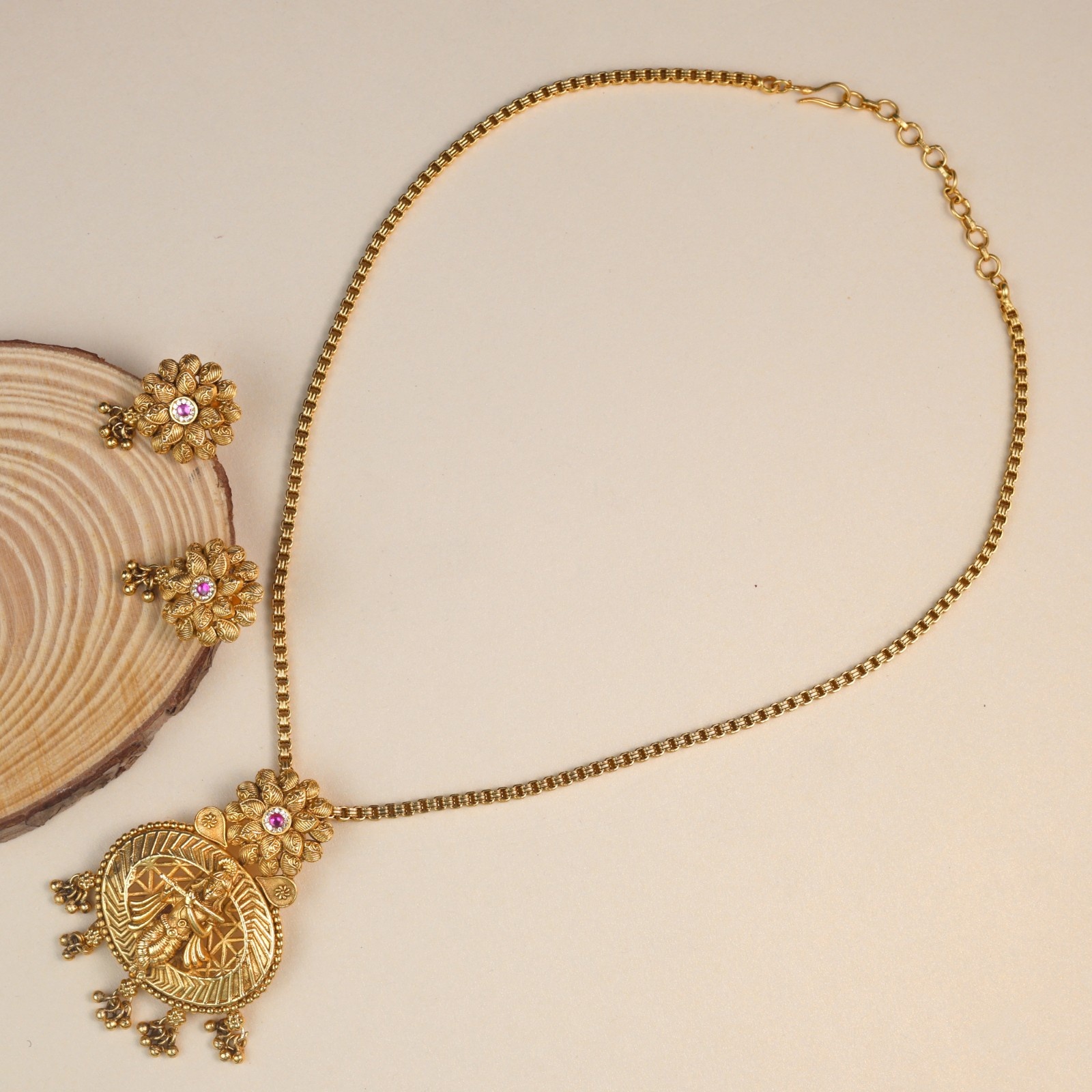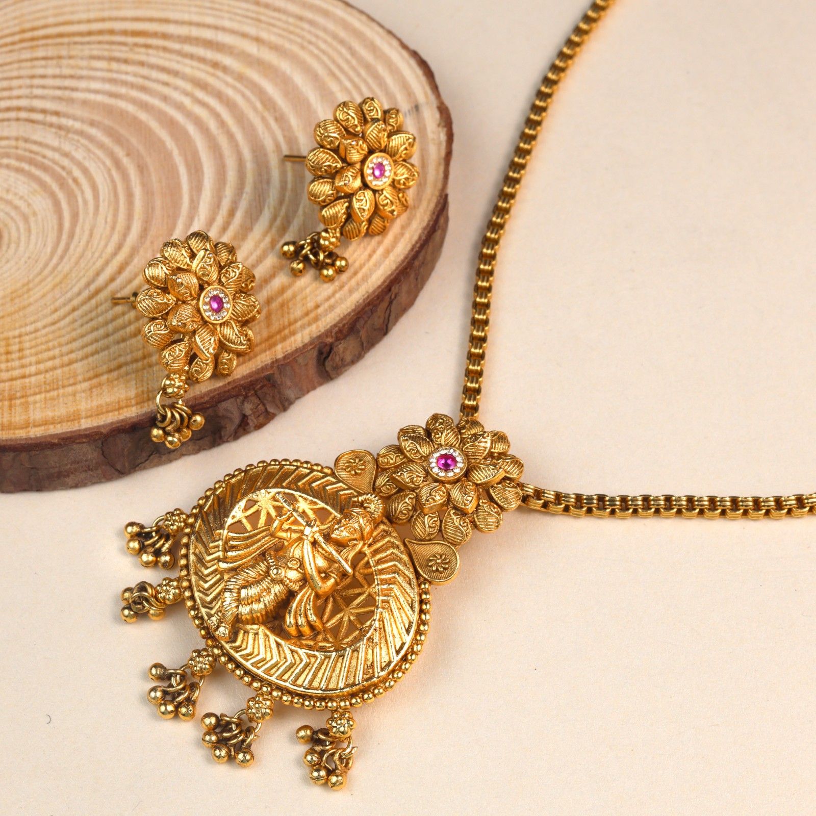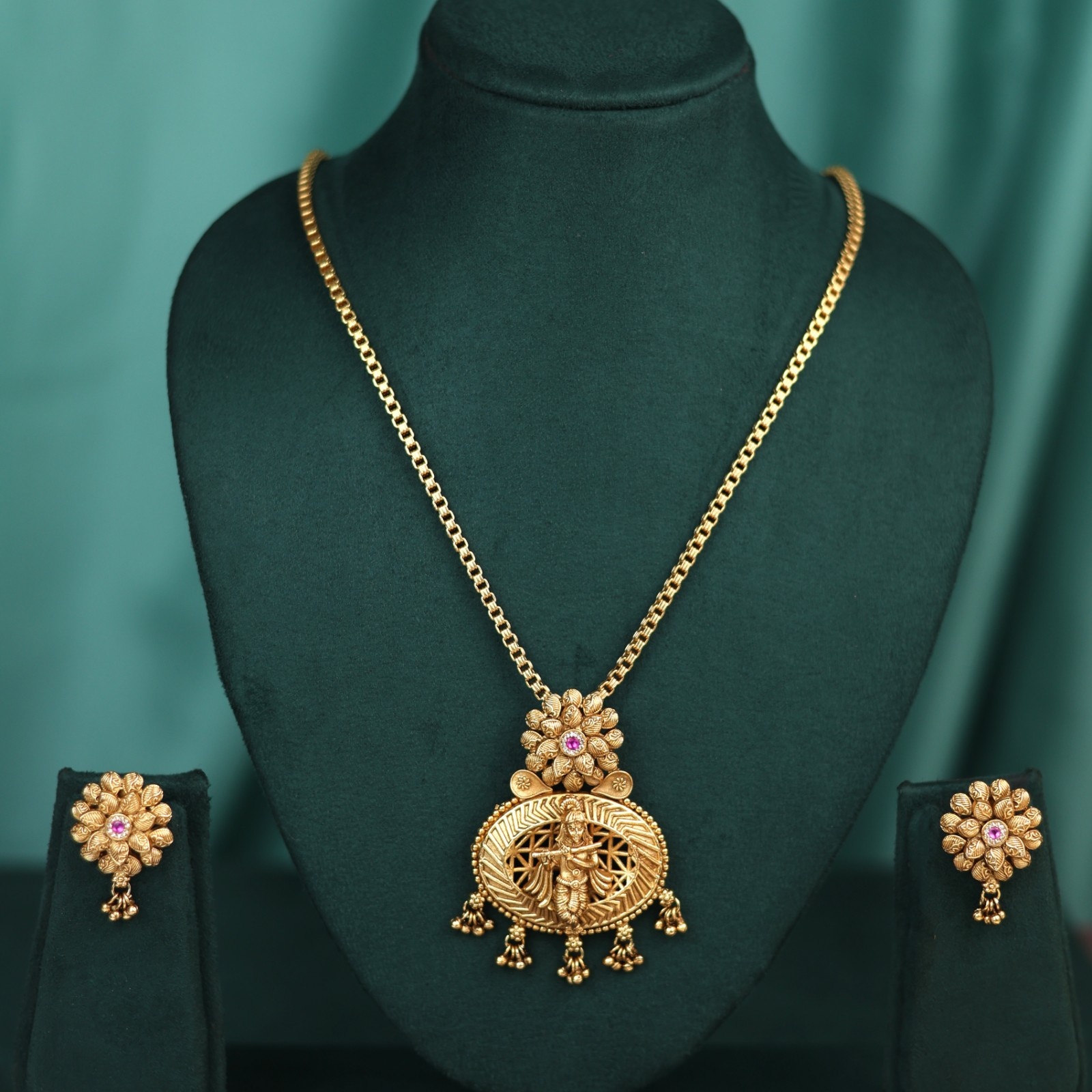 A timeless antique gold pendant set adorned with swarovski stone, featuring lord krishna's graceful form.