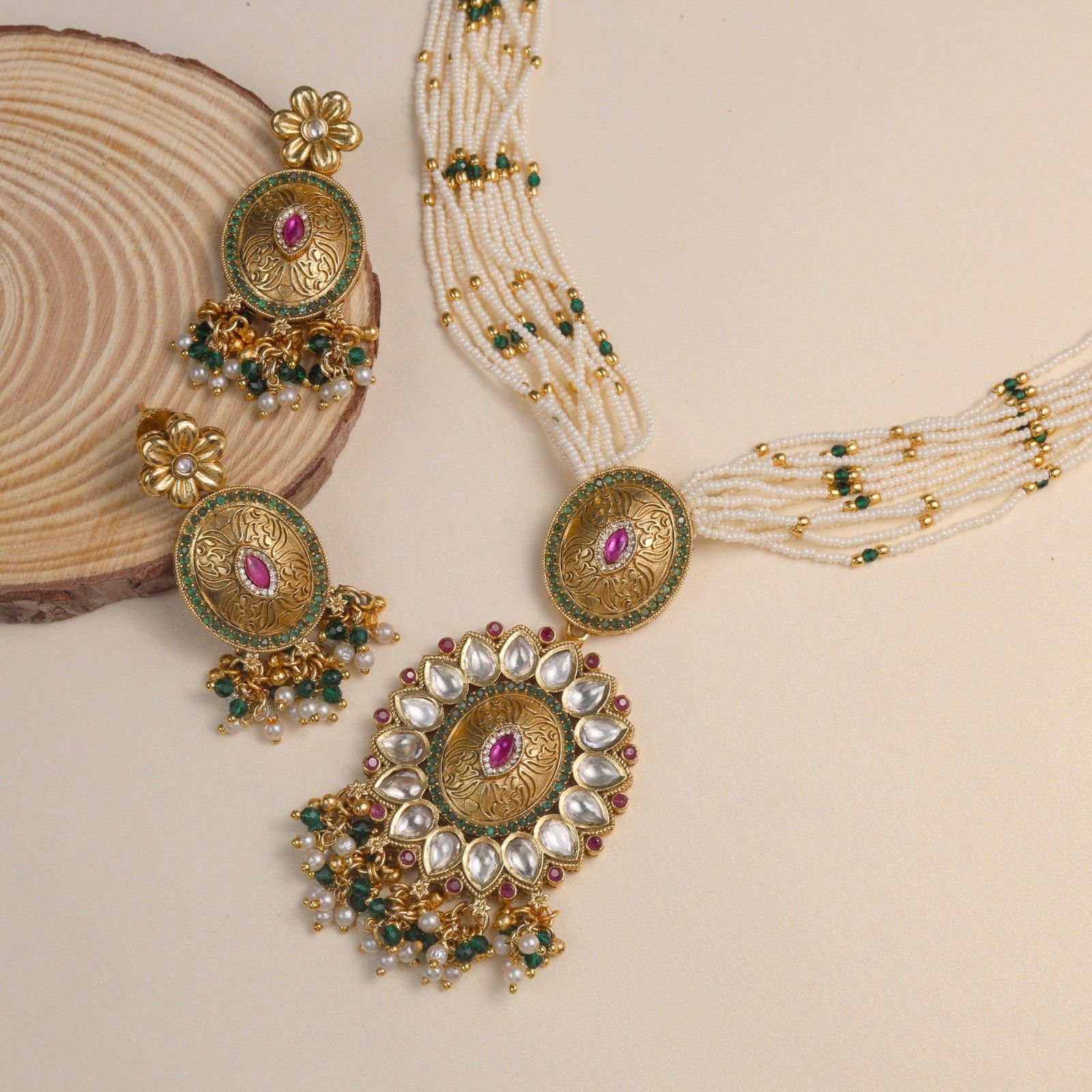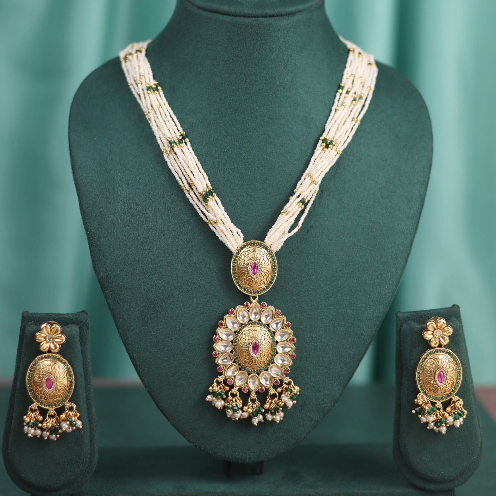 This pendant sets features finely engraved motifs with subtle pink stones highlights, creating a refined ethnic charm. The multi-layer moti mala designed combined with green bead accents adds balance and elegance. Paired with matching earrings, the set completes a charming and graceful look, ideal for weddings, festive gatherings, and traditional outfits.