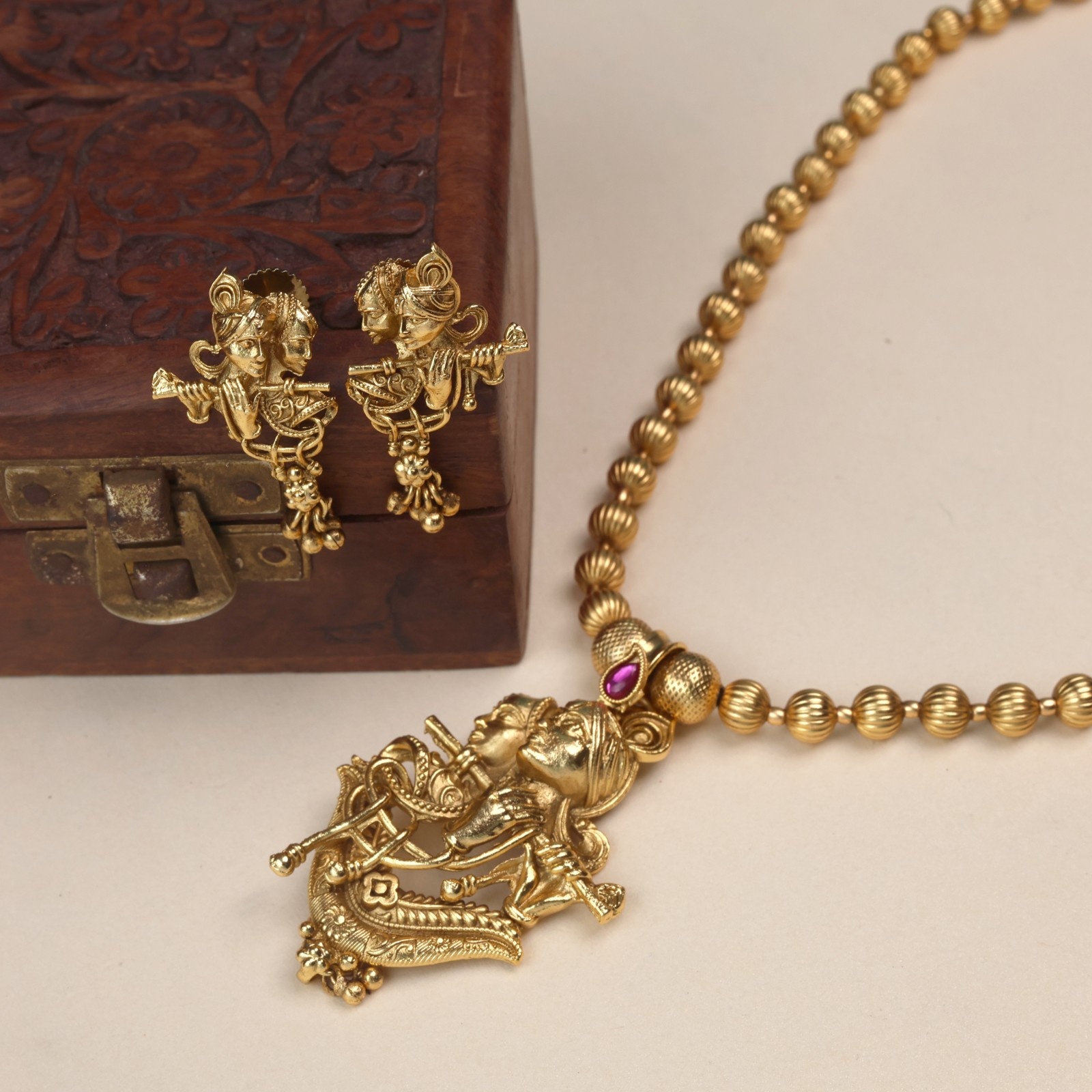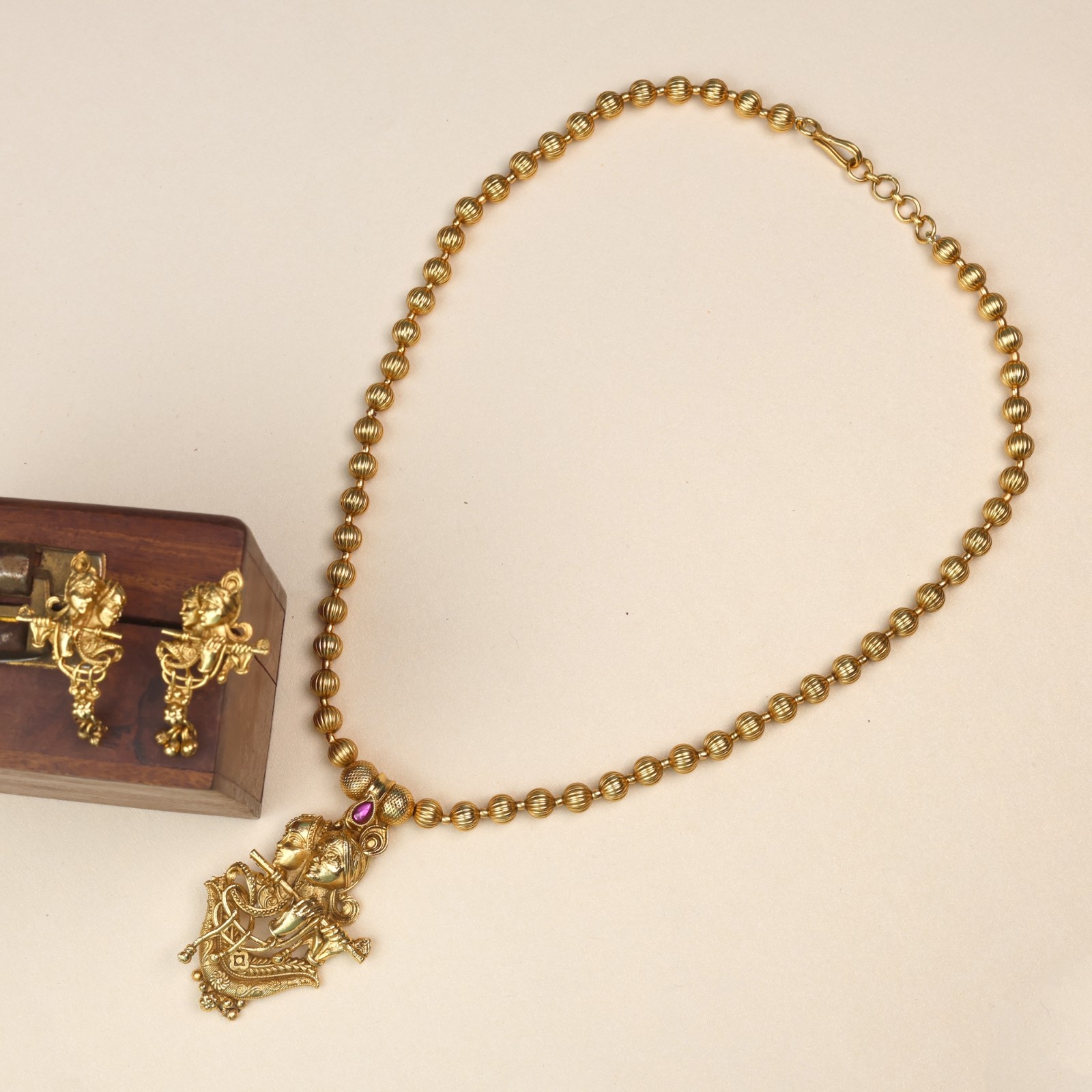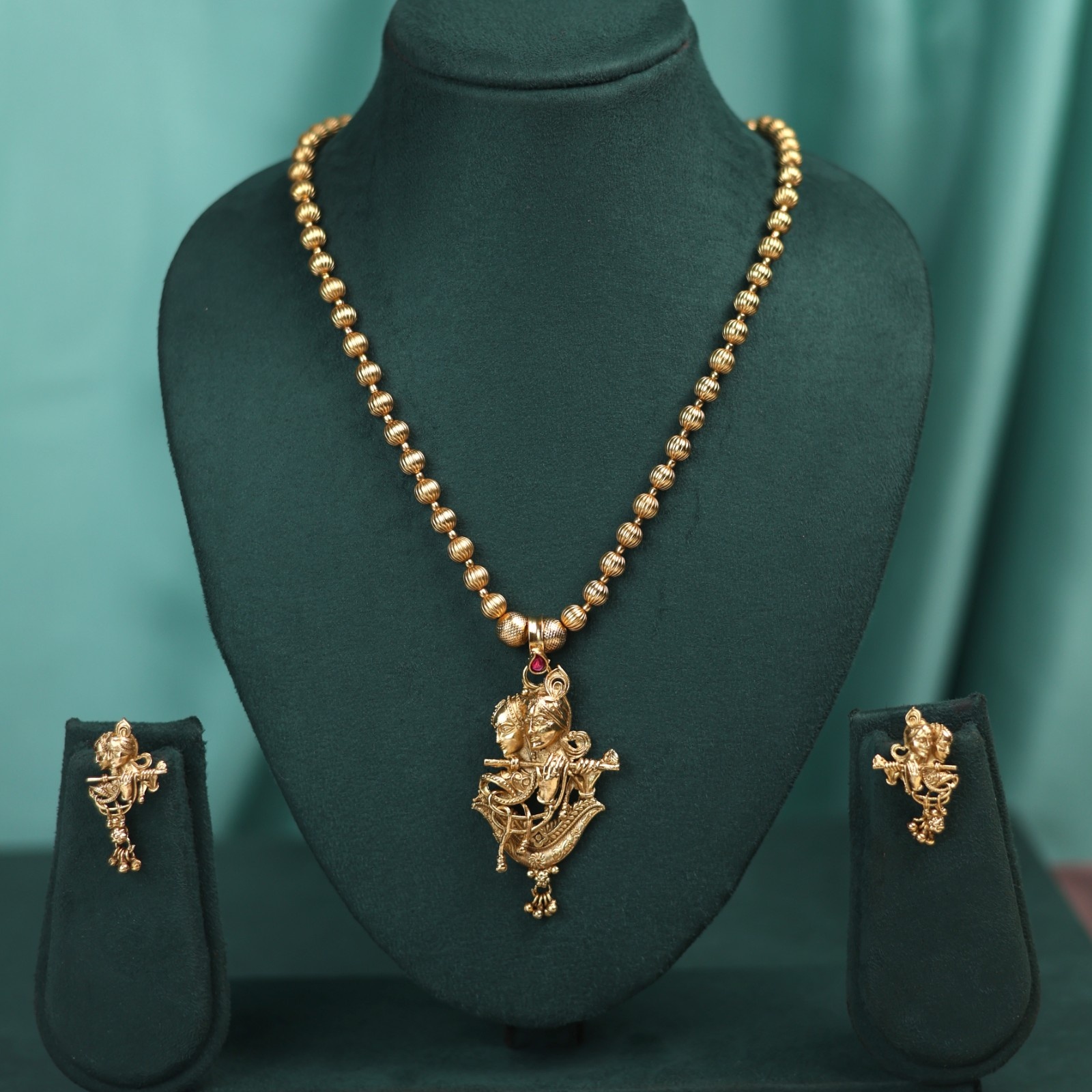 This temple antique gold pendant set is an exquisite piece that depicts the eternal bond of Radha and Krishna, the divine symbols of love, devotion, and harmony. The pendant showcases lord krishna with his flute alongside radha, representing the spiritual union of soul and supreme. The golden boll chain complements the pendant , enhancing its regal charm, worn during festive occasions, weddings and religious ceremonies, this set becomes more than jewelry- it is spirituals adornment carrying blessings of love and prosperity. With its antique finish and intricate craftsmanship.