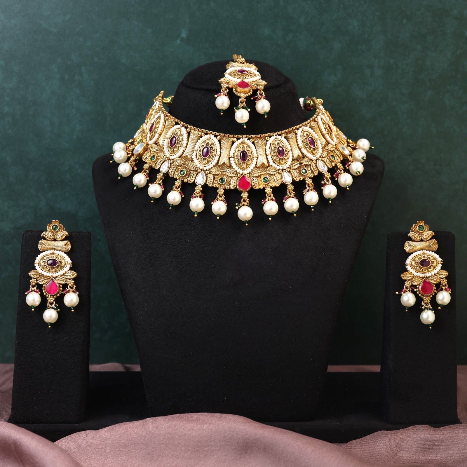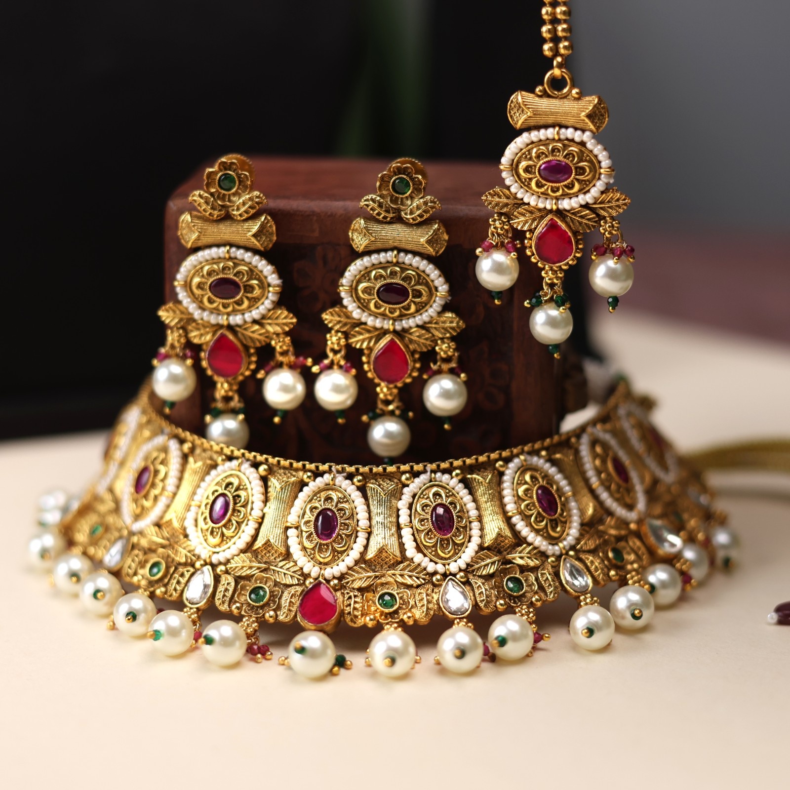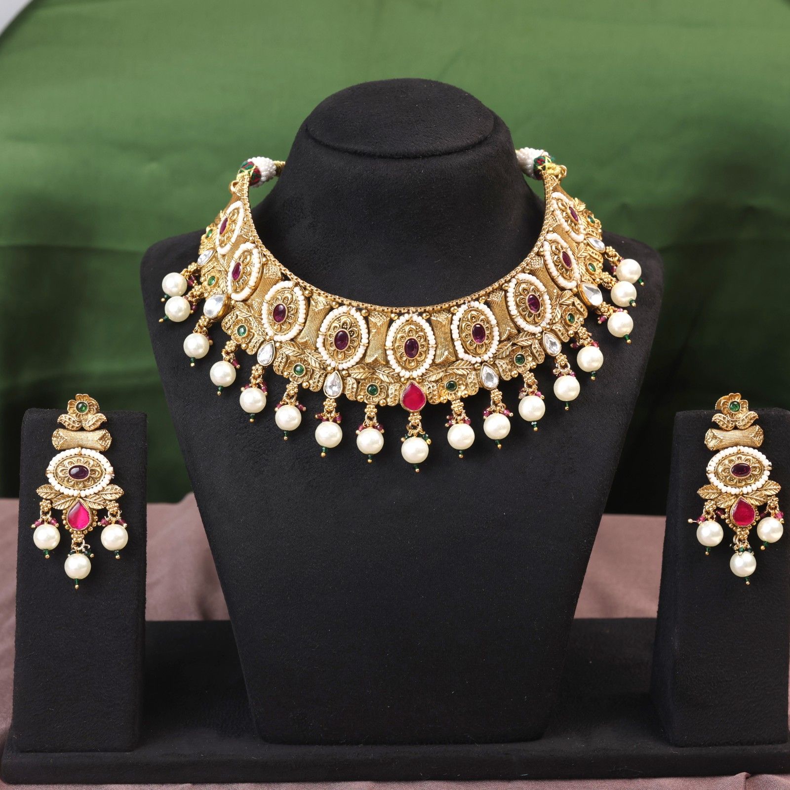 Crafted with intricate detailing reminiscent of Rajput Royal Jewellery traditions. Antique Gold tone adorned with shimmering pearls, ruby pink, and emerald green stones. A statement choker with matching earrings, perfect for weddings or cultural occasions. Handcrafted with precision stone settings and delicate enamel style embellishment Complements on Sarees, Lehengas and other ethnic ensembles for an royal touch.