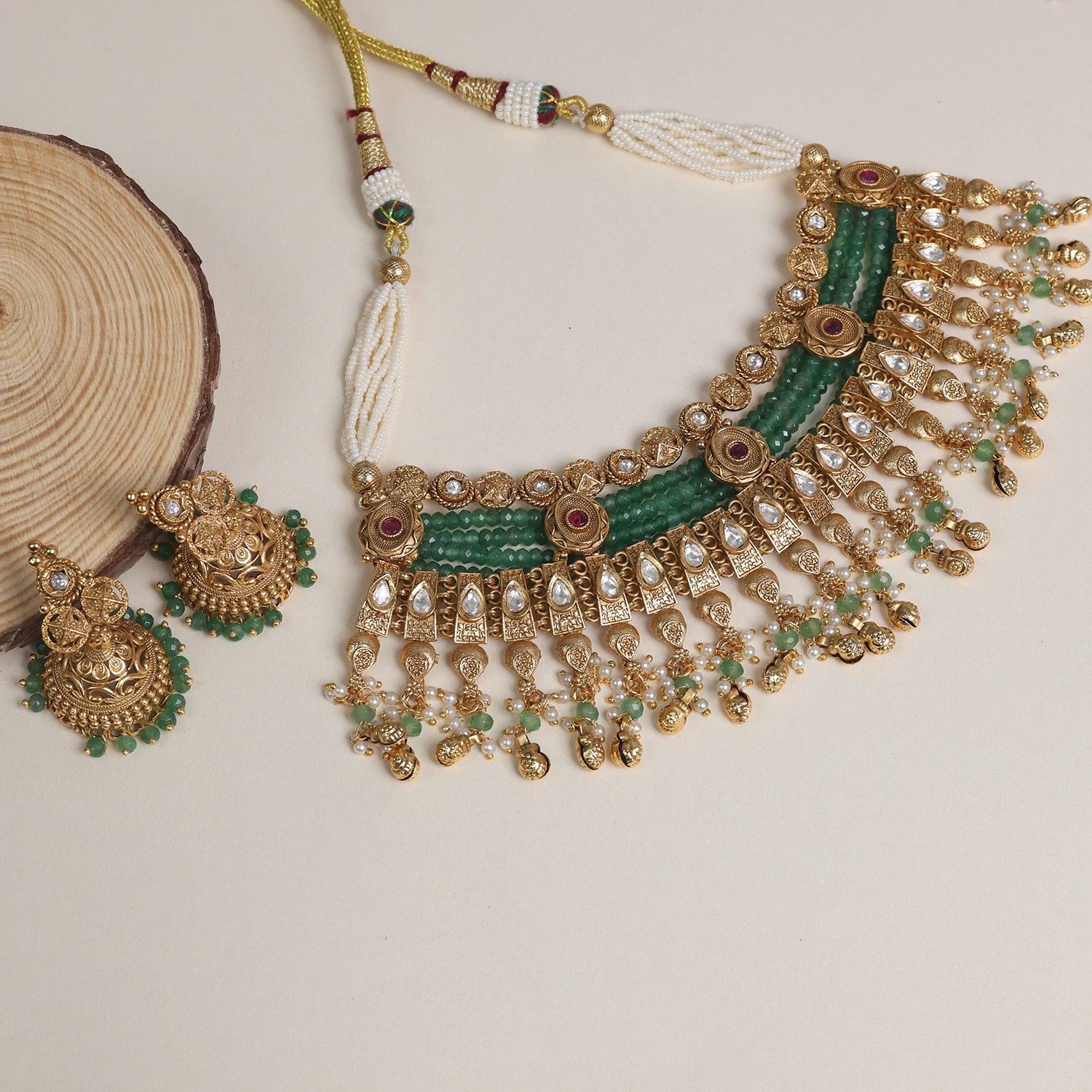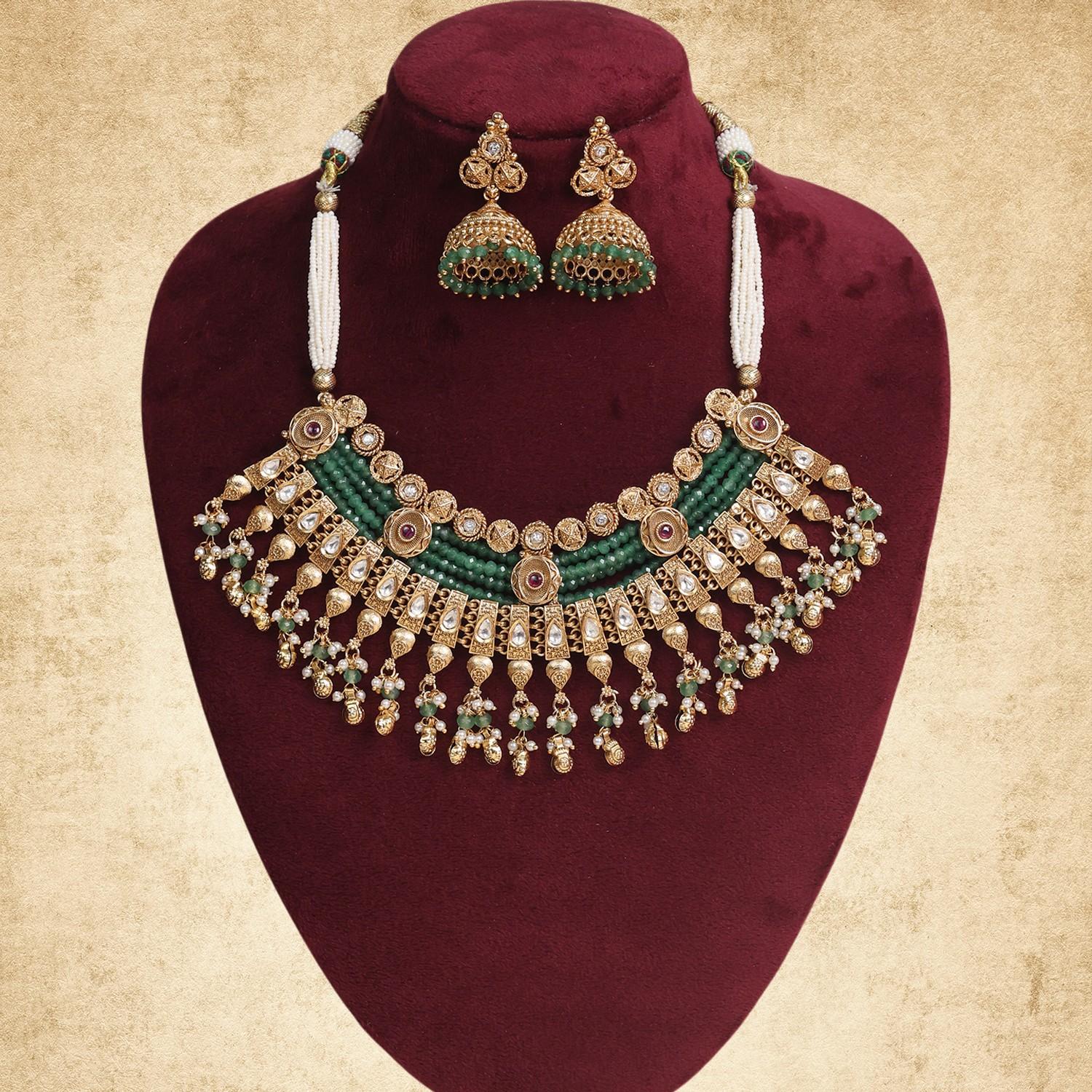 Complete your outfit with this eye-cathing Himani Aabhushan Jewellery Ruby-Green Gold polished Antique Necklace , designed with anintricate antique finish, this necklace is a perfect blend of tradition and contemporary elegance. Ideal for the festive season, making you the centre of attention at ay occasion.